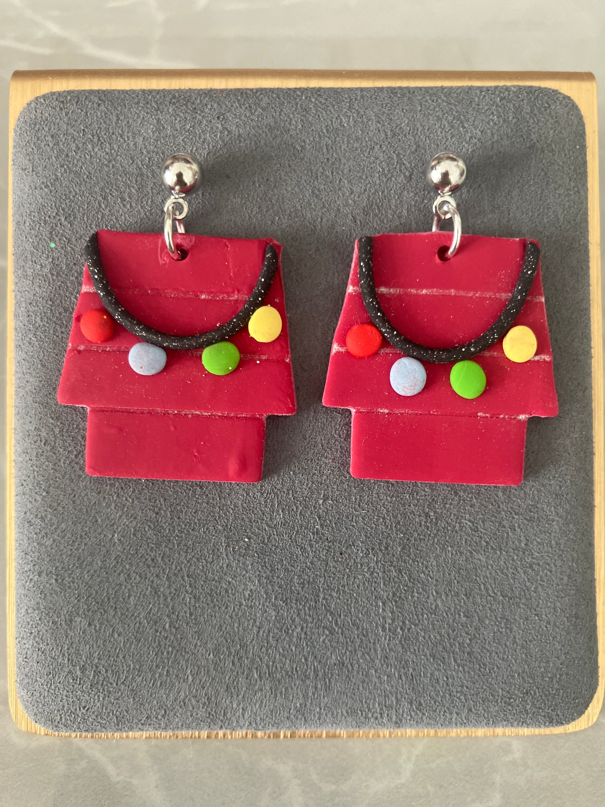 These festive dog house earrings are both lightweight and hypoallergenic. The houses are dusted with a pearl white to give it that snowy look. These are made using polymer clay - each house has a strand of red, baby blue, green and yellow lights.